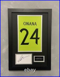 This is a unique opportunity to own a piece of football history. The hand-signed autograph of Andre Onana, a talented player from Manchester United, is displayed in a beautiful mounted display. This original piece is perfect for any football memorabilia collector or fan of the sport. The autograph is authentic and comes with a certificate of authenticity. It features the player’s signature and is a great addition to any collection. Whether you are a fan of Manchester United or simply appreciate football, this signed football is a must-have item. Comes with Perspex glass.